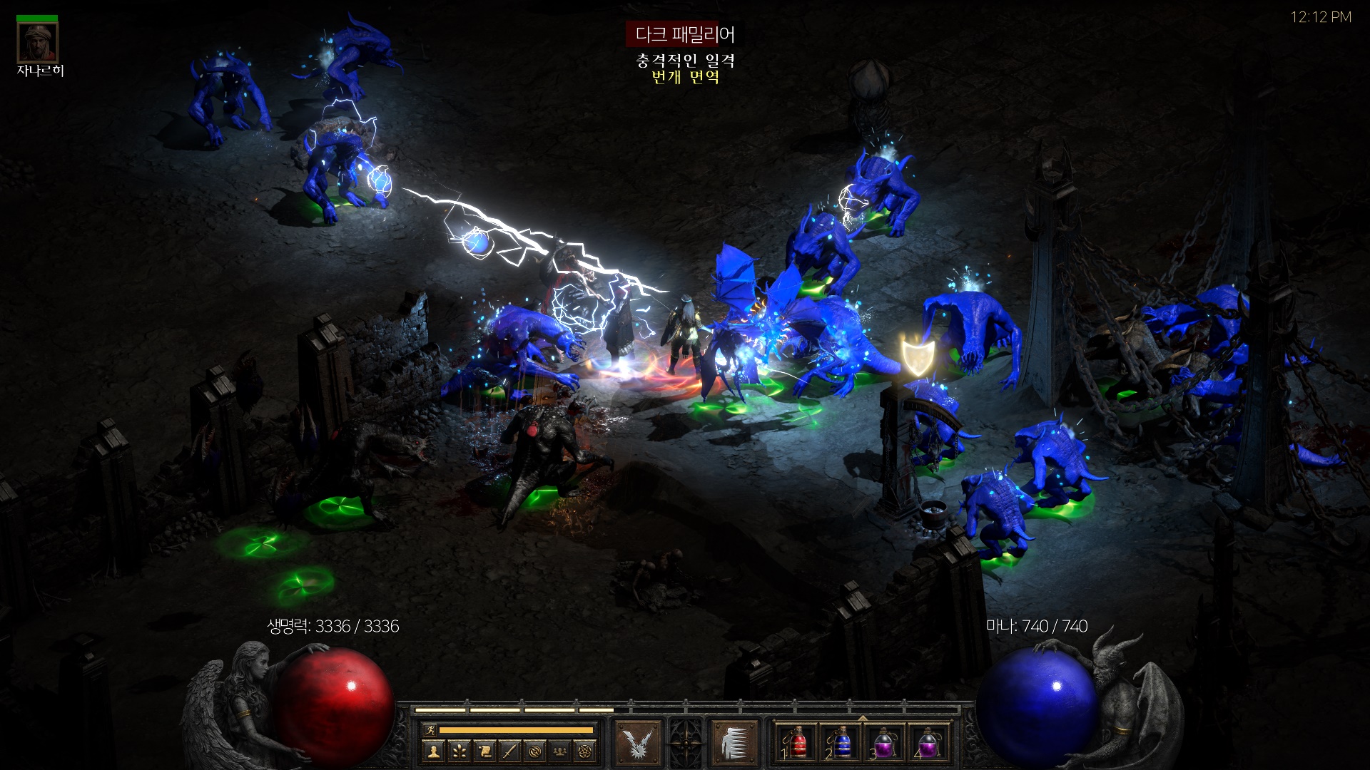 이렇게 녹색의 오라에 빠지게된 얘들에게는 번개 면역이 깨지고 번개 대미지가 들어가게 됩니다.
