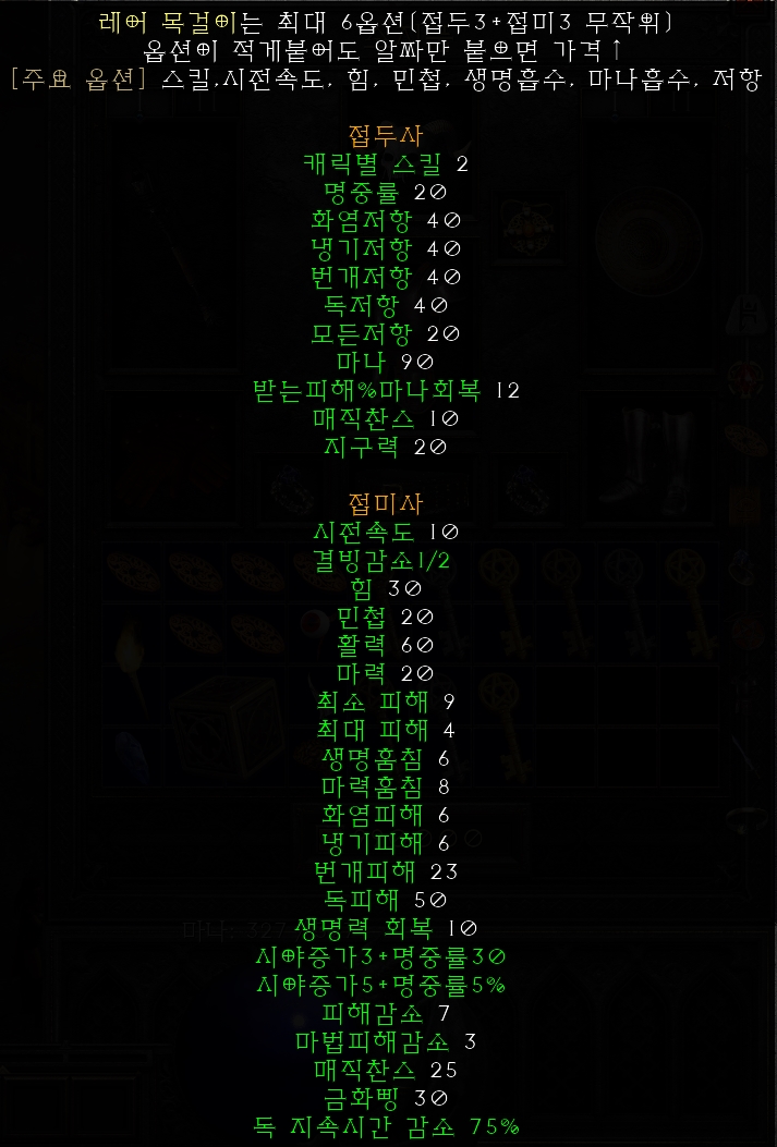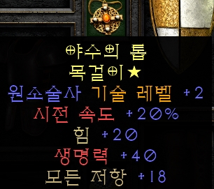모든 기술+2 모든 능력치+5 모든 저항은 +20 ~ 30까지 변동 옵션인 마라의 만화경 일명 마라아뮬입니다. 모든 기술+2와 올 레지 때문에 많이 쓰입니다. 그래서 모든 목걸이 아이템의 기준이 됩니다.