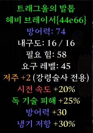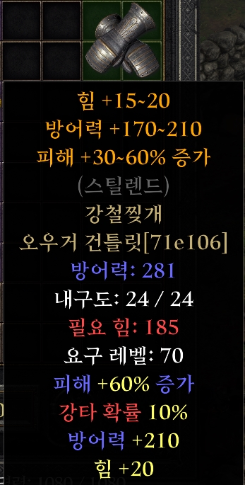 강철찢개입니다. 일명 오거장이라고 불립니다. 피해 +30-60% 증가 방어력 +160~210 힘 +15~20 이 변동적으로 붙습니다. 주로 밀리캐릭터인 야만용사나, 성기사들이 사용합니다. 힘이 185가 필요하기도