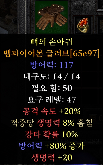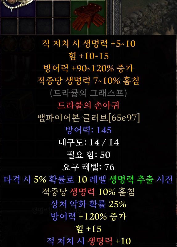 드라쿨의 손아귀 일명 뱀파장이라고 불리는 유니크 장갑 아이템입니다. 저는 뱀피장으로 알고 있었습니다. 변동 옵션으로 적중당 생명력 7-10% 훔침 방어력 90-120% 증가 힘 10-15 적 처치 시 생명력